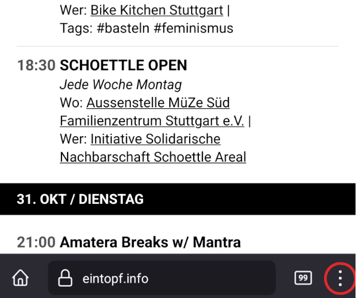 Es gibt eine Alternative: Die meisten aktuellen mobilen Browser wie Chrome, Firefox oder Safari bieten die Möglichkeit den Kalender auf eurem Homescreen zu installieren (Als Progressive Web App). Dazu ruft ihr auf eurem mobilen Gerät die Seite des Kalenders auf und wählt im Menü des Browsers oder direkt hier auf der Seite installieren aus, je nach Browser.